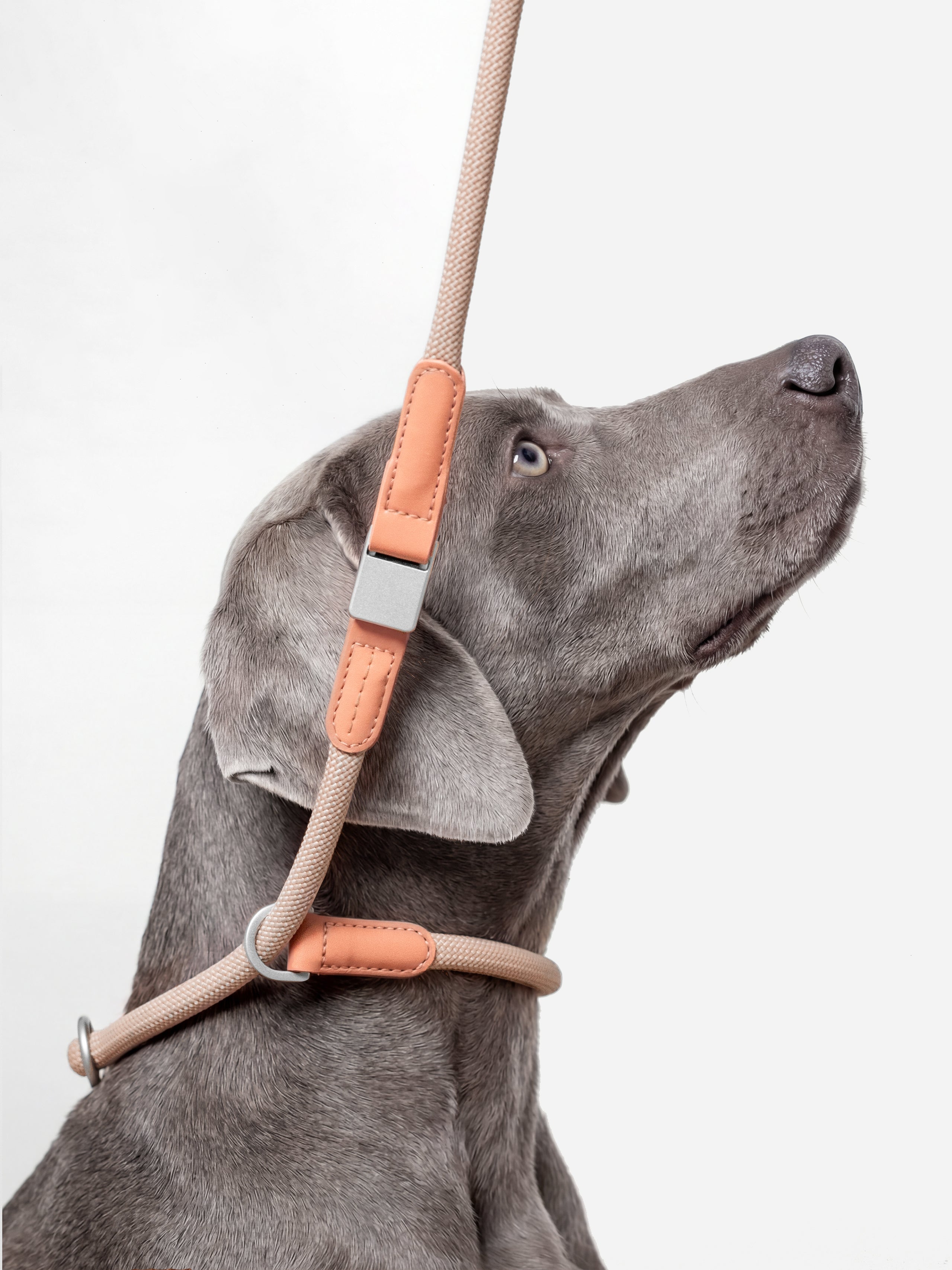 Morning collar. Afternoon harness. Weekend slip collar and rope. Two leashes, three ways to walk.
